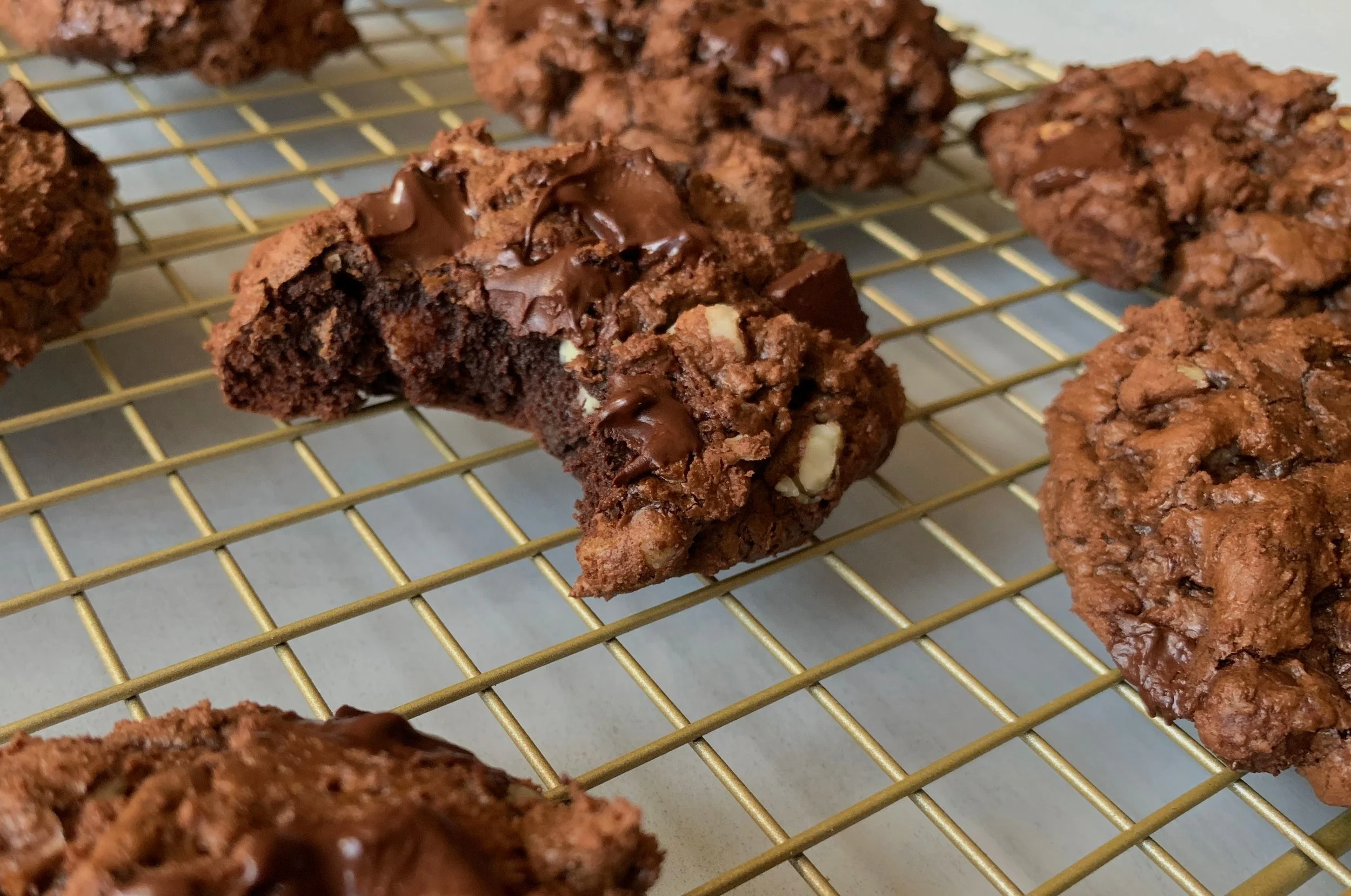 Introducing the Brookie: a cookie for those who love brownies (and brownie edges), and the convenience of a cookie shape. Crackling top, fudgy soft center, chocolate with bittersweet notes and the occasional crunch of a toasted walnut. Unlike chocolate chip cookies which require hours in the fridge, and eggs at room temperature, these brookies take less than 30 minutes to prepare and 1 hour to harden in the refrigerator. Within 90 minutes you will have chocolate brookies that will satisfy every chocolate loving bone in your body.