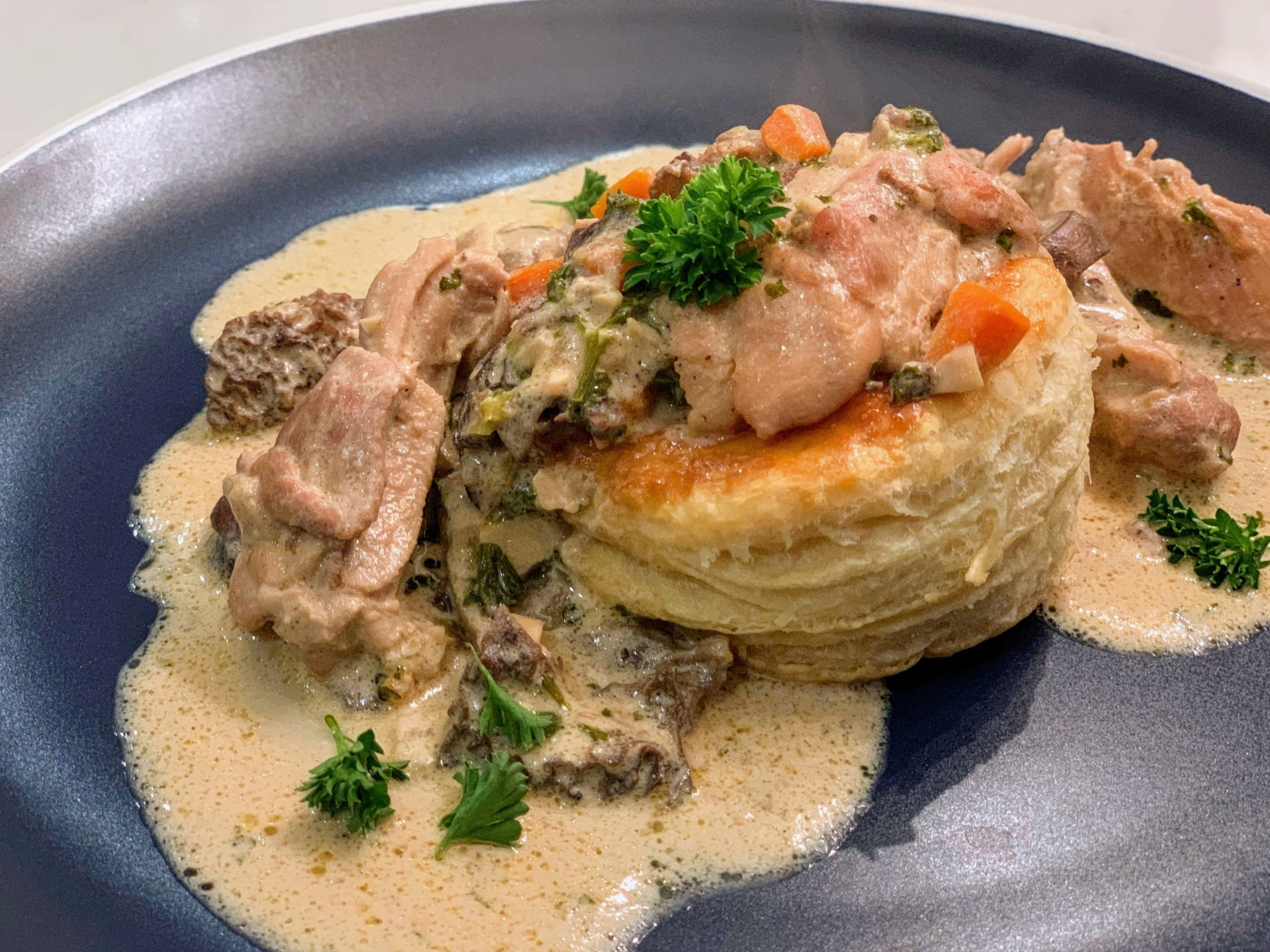 A vol-au-vent pastry with mushrooms and chicken cream sauce