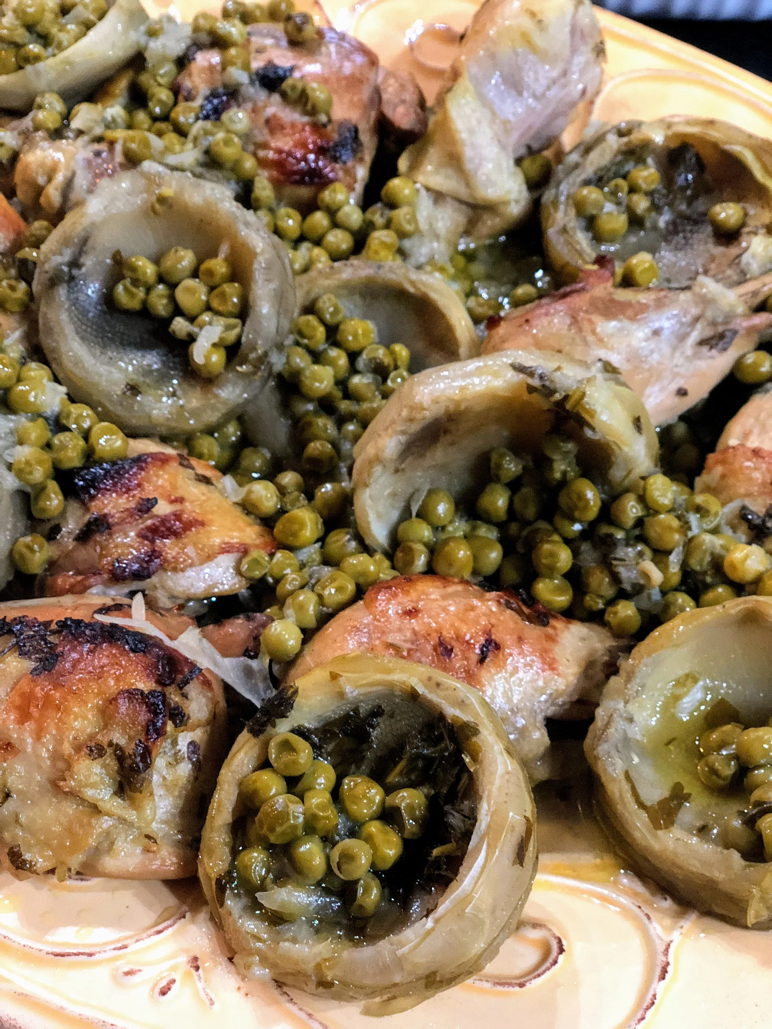 the artichoke bottoms and green peas go so well together. Both are sweet and starchy. Cook it with preserved lemons or serve it with wedges of lemon, the lemon juice will cut through the sweetness and fat of the chicken for a well balanced dish.