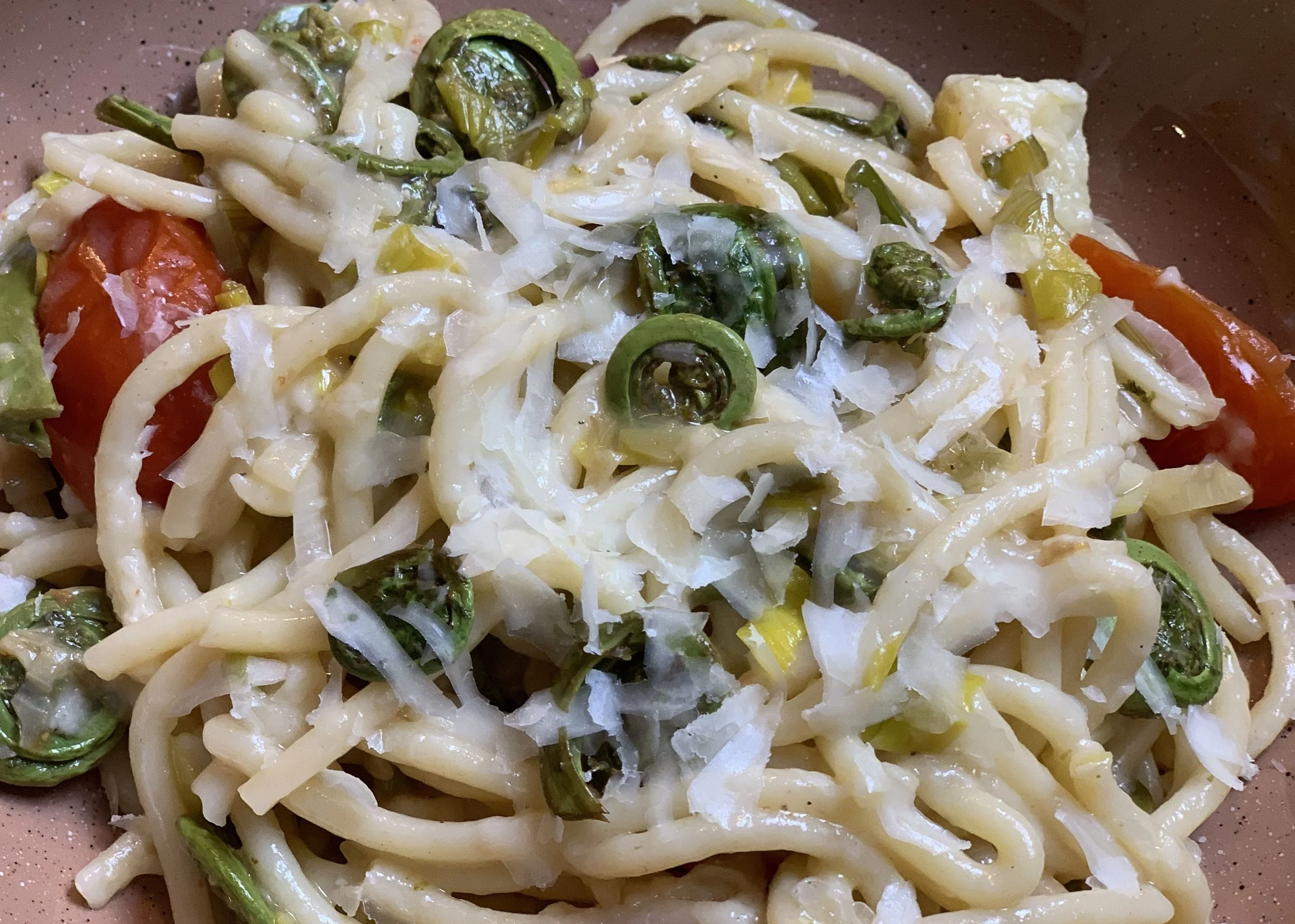 Carbonara recipes traditionally include pancetta or bacon which makes it a hard dish to make for vegetarians or people who donβt eat pork. In this version, we make the same delicious creamy egg-based sauce but we flavor it with garlic and leeks. The fiddleheads add texture and a subtle spring flavor. The tomatoes add tart juiciness.