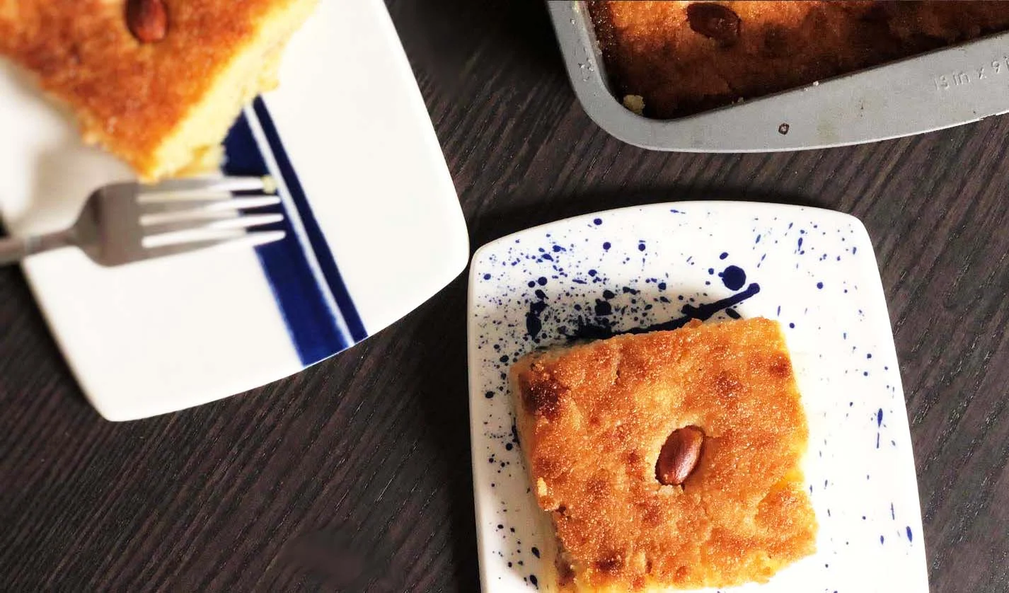 Qalb Allouz is a staple dessert in Algeria during Ramadan. It is as much of a staple as shourba and bourak. It’s a sweet, happiness in every bite kinda of treat. Qalb Allouz literally translates to the heart of almonds which some say refers to the almond that adorns the middle of each slice or the ground almond layer that is sometimes added. There are so many variations and ways of making this dessert and it’s very difficult to get it just right. I’ve tried several different methods and have failed miserably. Some people swear by letting the semolina mix rest overnight before baking as the key step, while others mention the quality of semolina, or the type of fat that is used be it butter, oil, or shortening. I definitely was not team let the semolina rest overnight, because I’m not waiting two nights to eat a dessert. Neither am I a fan of using shortening. After several trials, I’ve found something that works and tastes like the Qalb Allouz found in all the bakeries in Algeria during the month of Ramadan. Give it a try!