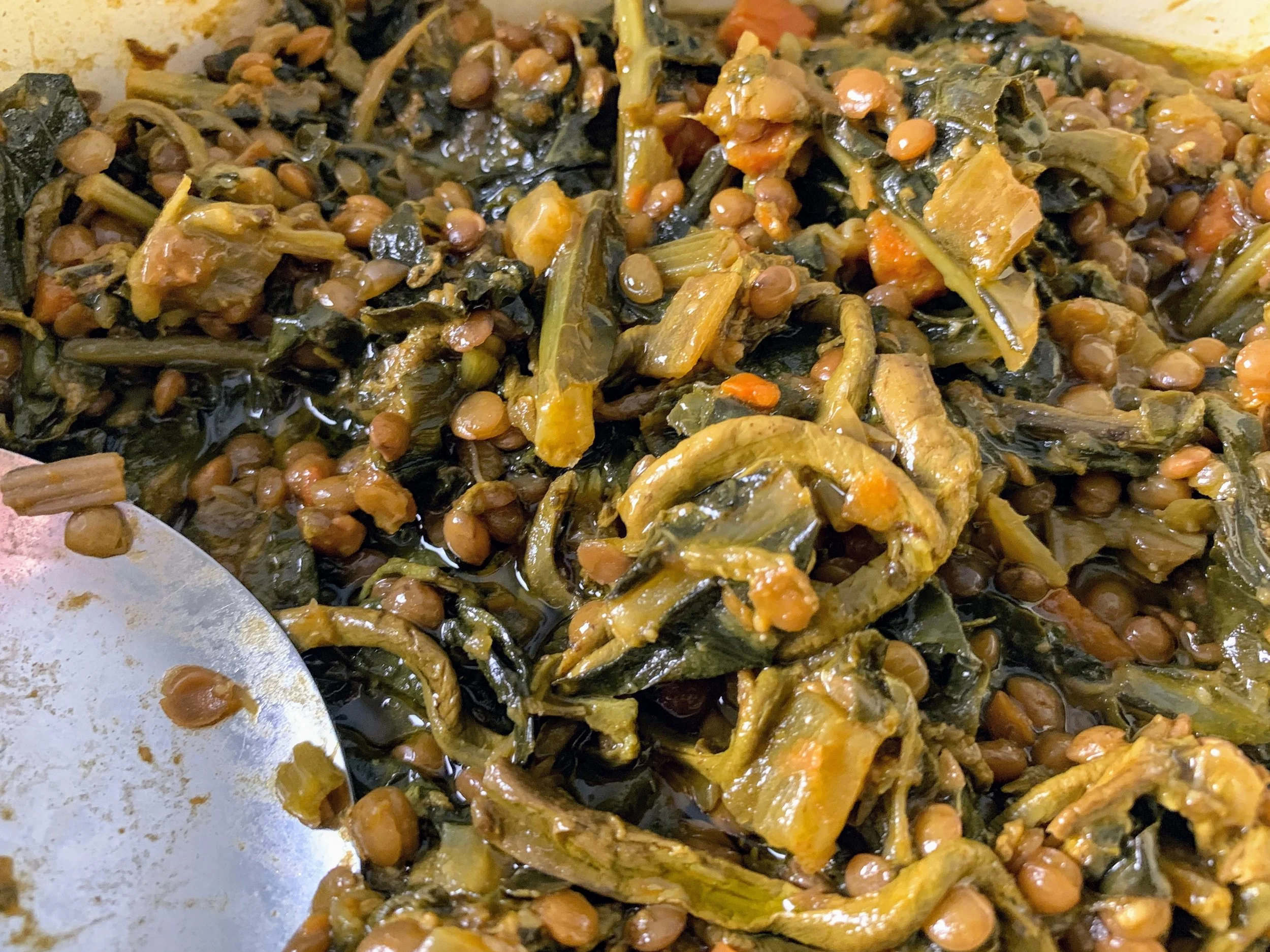 The sweetest veggie loaded meal: melting lentils with kale and spring fiddleheads